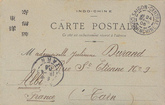 Postée en 1906 mais vue antérieure, carte postale de 1900, idéogrammes chinois qui disent peu de chose si ce n’est à expédier à l’adresse.