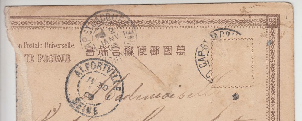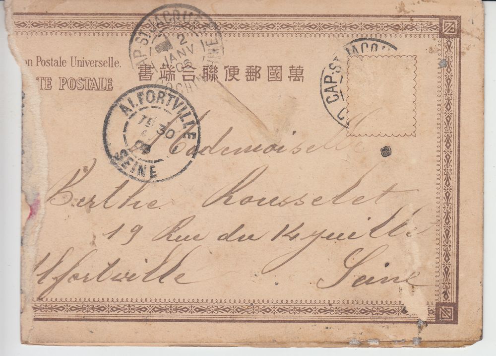 Cette image, prise dans les collines de Cap Saint-Jacques en 1906, est une photo d’amateur collée sur un support de carte postale japonaise. Expédiée le 2 janvier 1906, elle a voyagé jusqu’à Alfortville, où elle fut reçue par Mademoiselle Berthe Rousselet. Le timbre, décollé, a rejoint une collection philatélique, laissant la carte orpheline de son sceau postal.