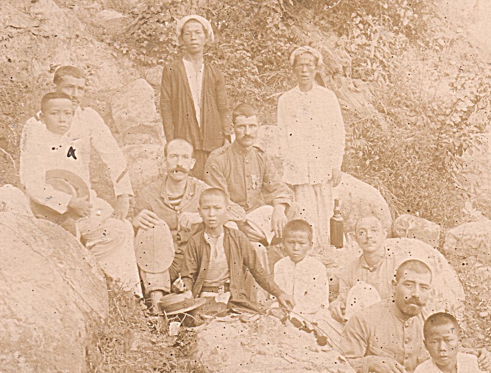 La photo immortalise un moment de détente entre militaires, accompagnés de jeunes garçons — probablement des boys locaux — chargés de porter les vivres pour ce repas festif. Une bouteille de vin, posée sur un rocher, trône au centre de la composition. Au cœur de l’image, un soldat décoré de deux médailles attire l’attention, symbole d’honneur et de distinction.