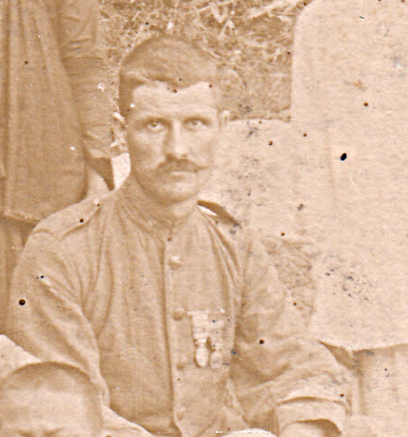 Le personnage que l’expéditeur a tenu à signaler à Mademoiselle Berthe Rousselet n’est pas le soldat décoré au centre de l’image, mais le sergent situé à gauche, marqué d’une croix tracée à l’encre. C’est lui qui a sélectionné cette photo, l’a collée sur un support de carte postale japonaise, et l’a envoyée — transformant ainsi une scène de groupe en un envoi personnel.