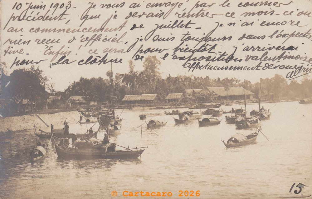 L’une immortalise Cholon, quartier animé et emblématique de Saïgon, tandis que l’autre capture une scène paisible : des sampans amarrés au bord d’une petite baie, à l’abri des regards. Ces clichés, pris par des amateurs passionnés de photographie, étaient bien plus que de simples images. Ils devenaient des souvenirs tangibles, des fragments de vie partagés avec la famille et les proches restés en métropole. À travers ces envois, c’était toute une passion qui s’exprimait, mêlant curiosité, art et désir de communication.